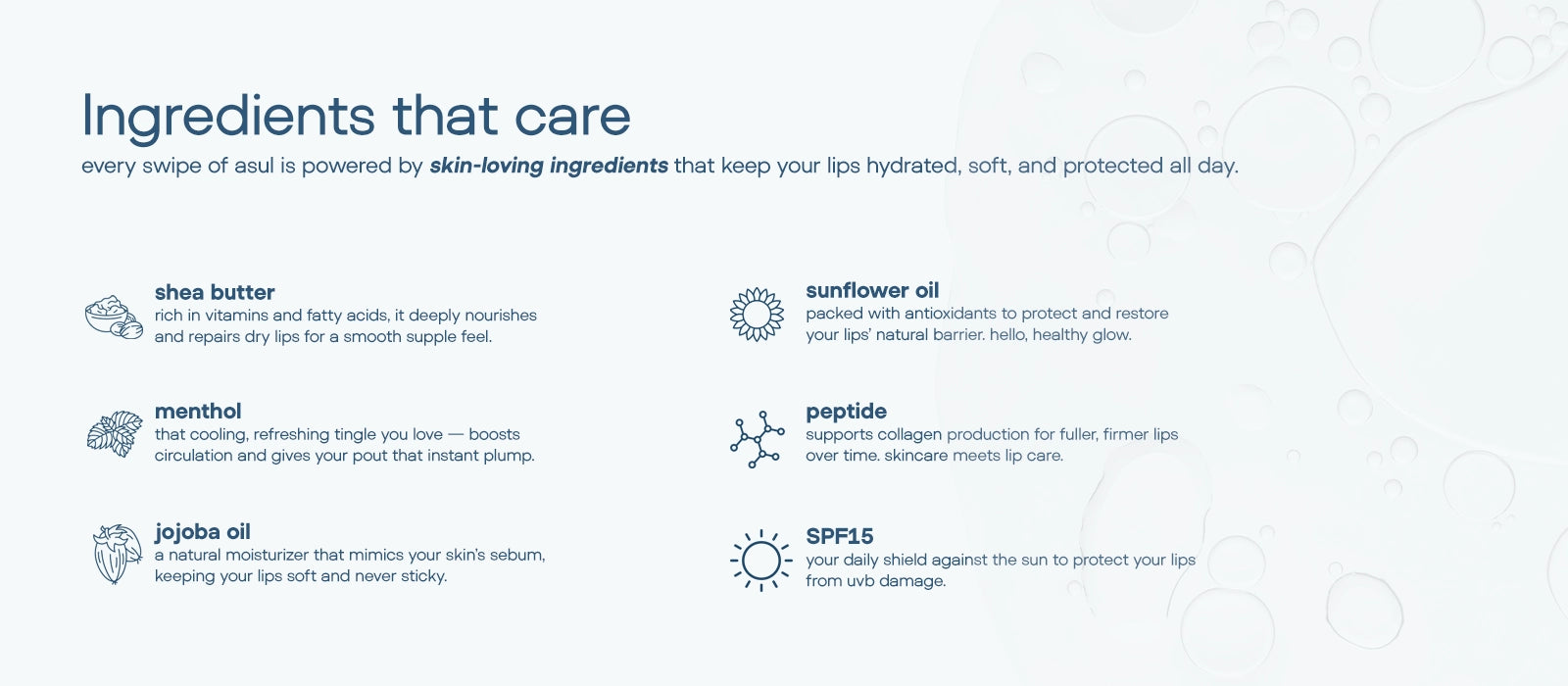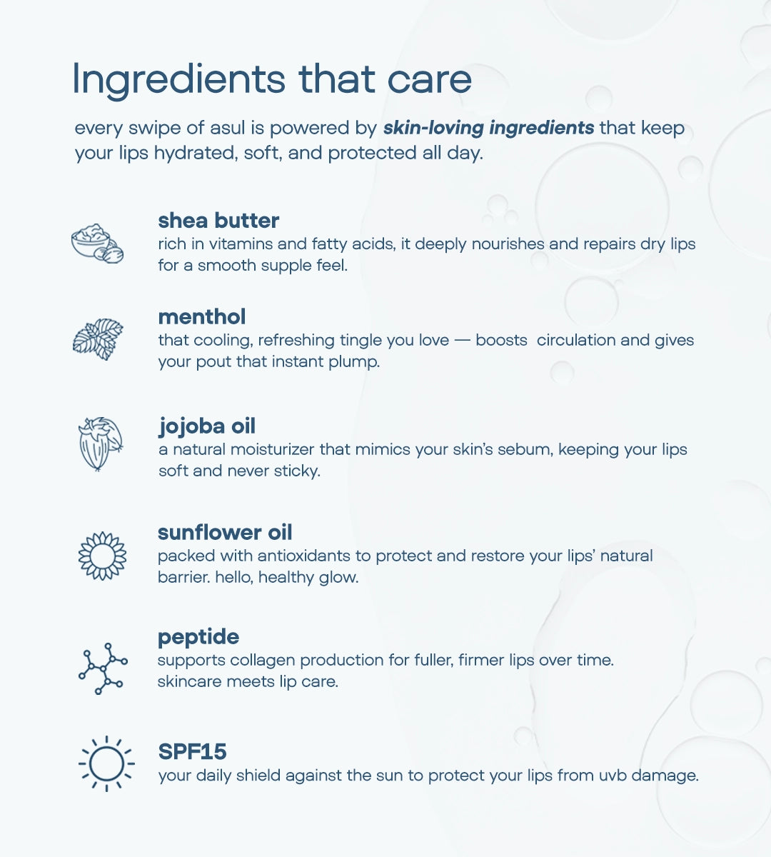 Lightweight, glossy, and soothing. Asul keeps my lips soft even on busy days.